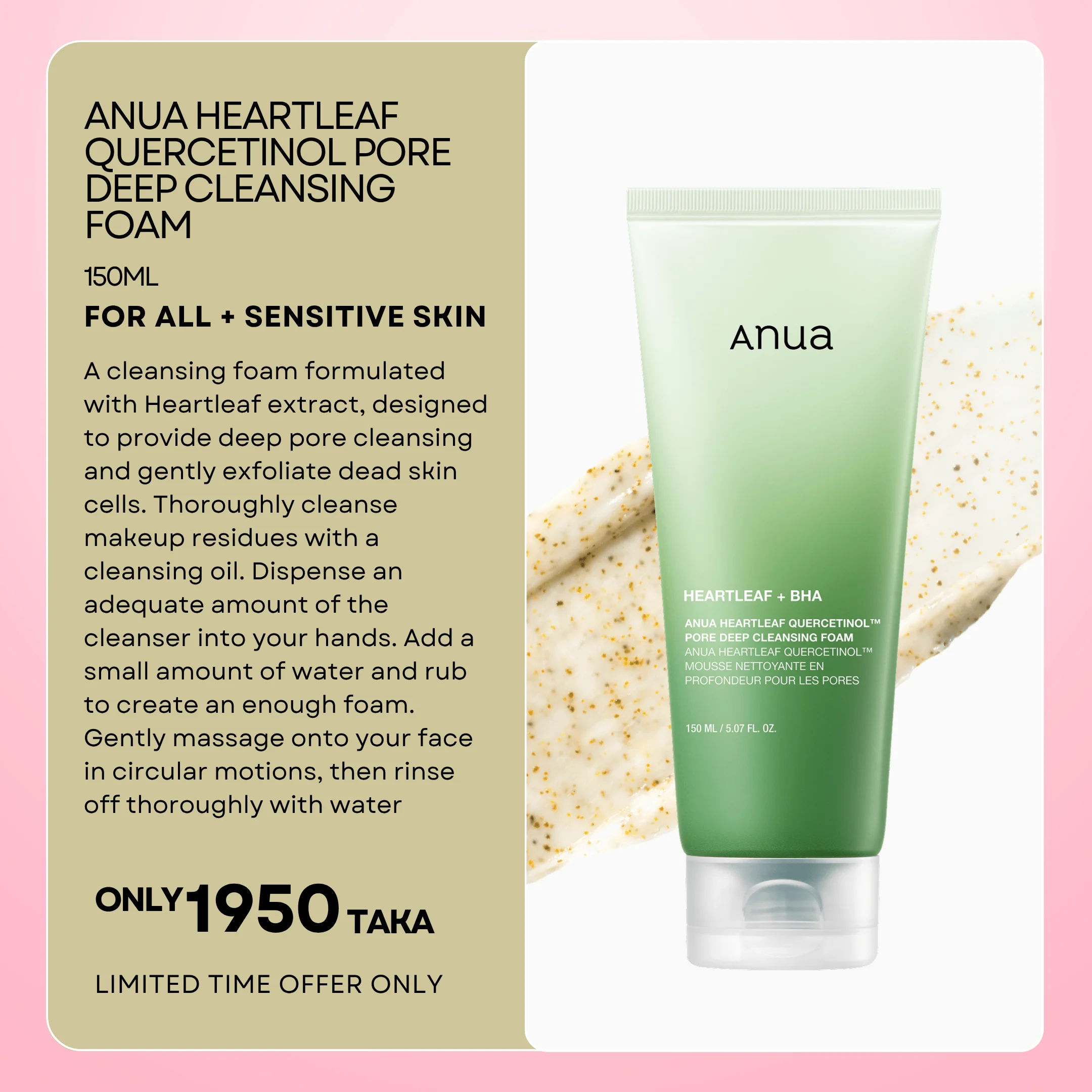 The cleansing foam contains Houttuynia Cordata Powder to remove dead skin and waste in pores. Contains Houttuynia Cordata Extract and Quercetin to calm the irritation caused by cleansing. Includes patented Anti-Sebum P (Pueraria Lobata Root Extract, Ulmus Davidiana Root Extract, Pinus Palustris Leaf Extract and Oenothera Biennis (Evening Primrose) Flower Extract) to remove excess sebum. Suitable for acne-prone skin.