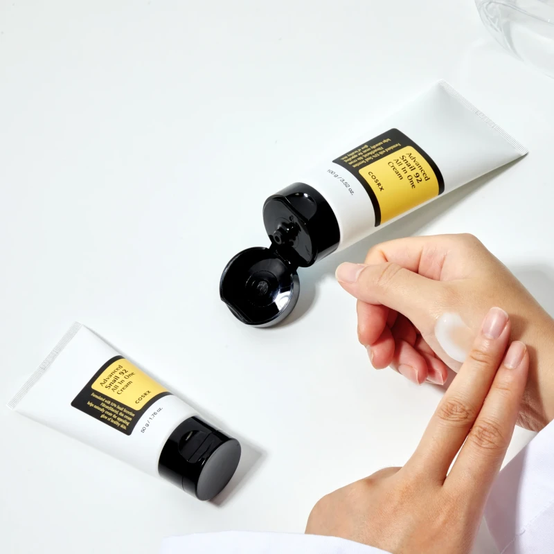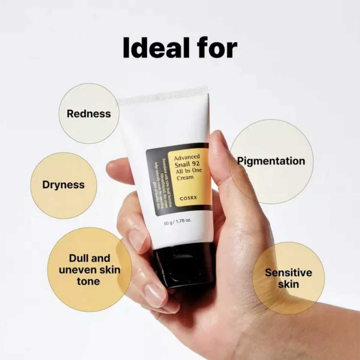COSRX Advanced Snail All In One Cream contains 92 snail mucin is a multivitamin for your skin to nourish, repair, and plump with moisture. 92% of Snail Secretion Filtrate helps protect the skin from moisture loss while improving skin elasticity, brightens, hydrates, and supports healthy skin repair. Light- weight snail cream which absorbed into skin fast and gives skin natural glow from inside without oiliness.