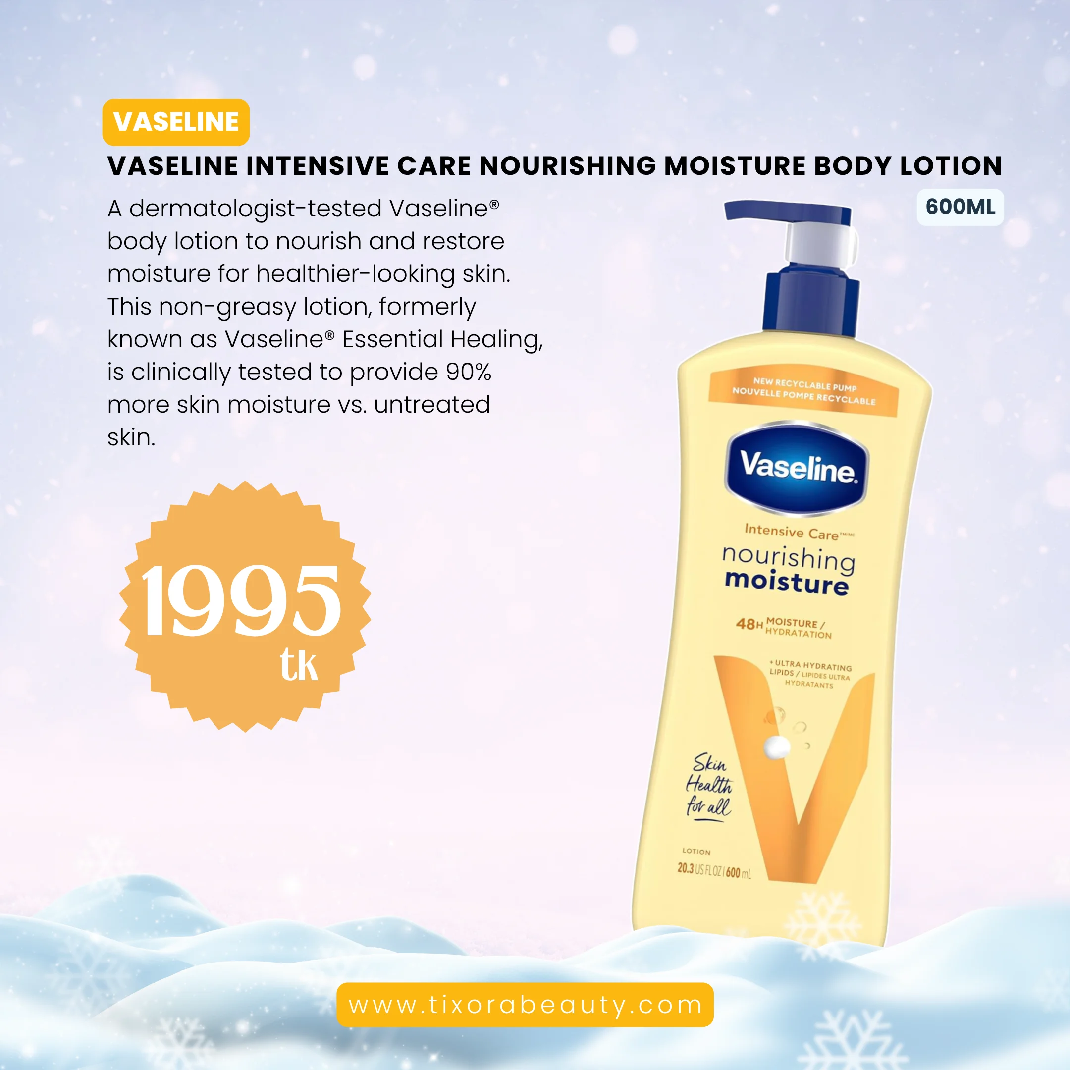 Original price was: 380৳ .275৳ Current price is: 275৳ .Vaseline Intensive Care Nourishing Moisture Lotion Body Lotion for Women Dry Skin 600ml