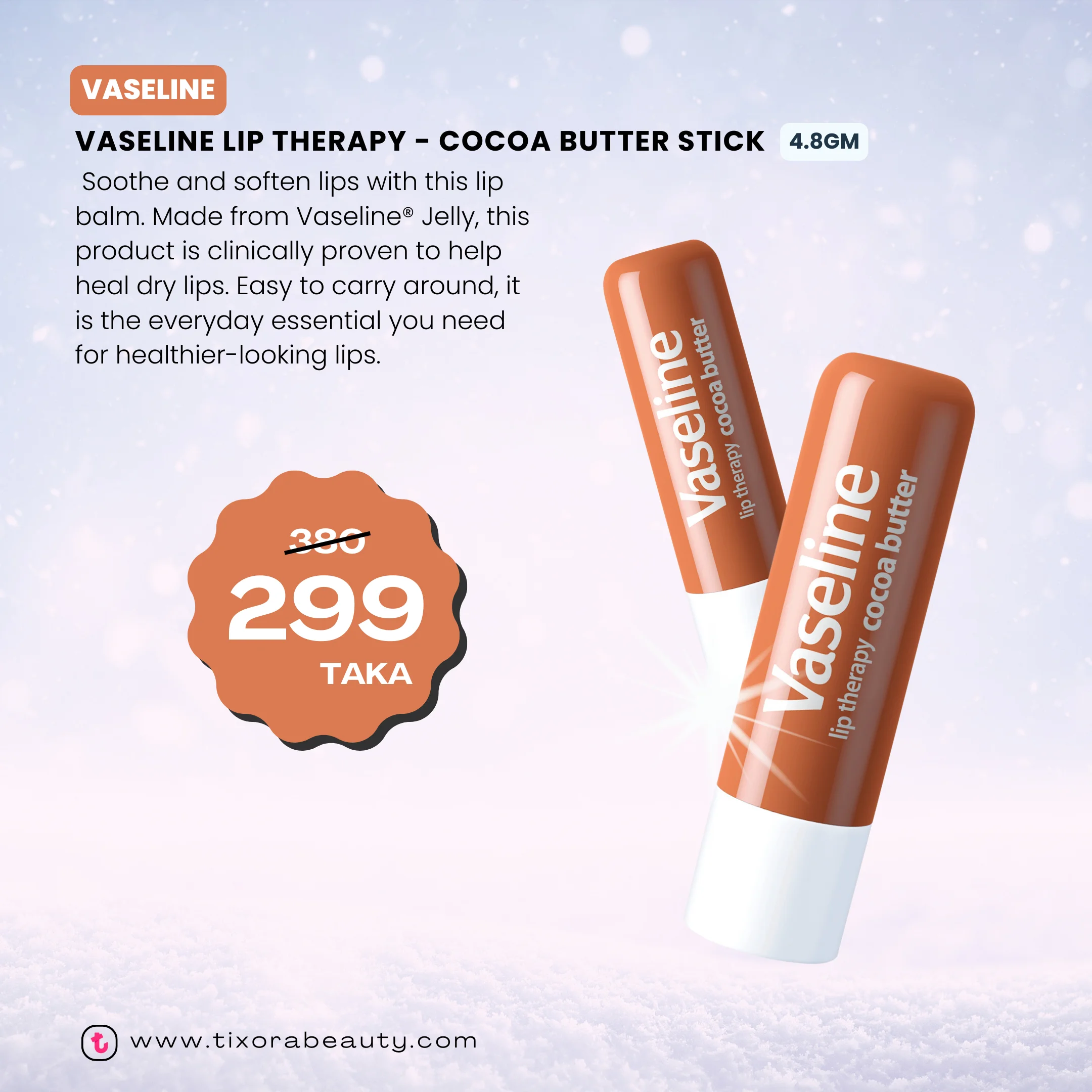 Made with Vaseline® Jelly, which provides long-lasting moisturization and lip care by locking in moisture.
